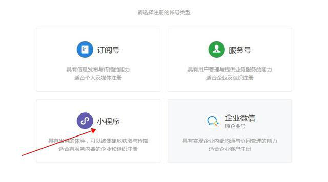 3、選擇注冊(cè)賬號(hào)的類型,我們選擇小程序。