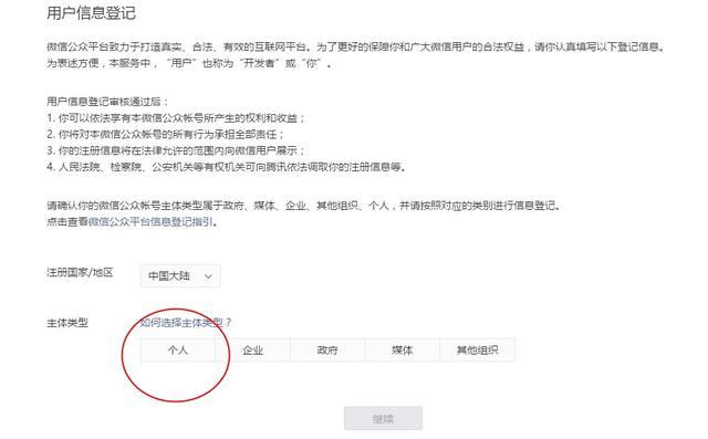 6、激活后,選擇用戶信息主體類型個(gè)人需要注意的是個(gè)人類型暫不支持微信認(rèn)證、微信支付功能。企業(yè)主體信息提交后不可更改。